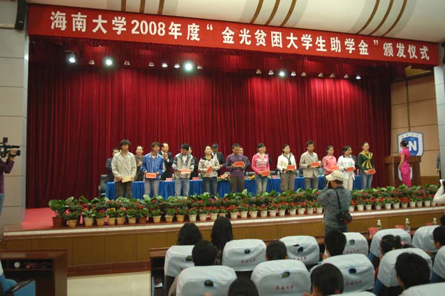 12月9日,海南大学2008年度“金光贫困大学生助学金”颁发仪式在该校办公楼二楼报告厅举行,600名贫困学生共获得了100万元助学金。